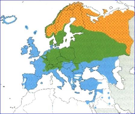 En vert : espèce présente toute l’année ; jaune-orange : présente en été ; bleu : hôte hivernal.