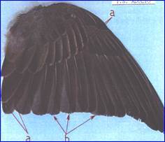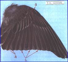 a : Grandes couvertures et une ou deux rémiges tertiaires avec à l'extrémité, une tache blanche apicale et triangulaire très marquée.